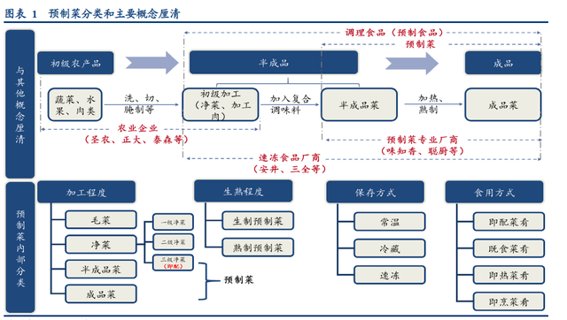 预制菜顾名思义是提前预制而成的菜品,但其实预制菜是一个很宽泛的概念。根据提前加工的复杂程度可以进一步进行分类。从经过洗、切、腌制的酒店用即配菜,到开袋即食的成品菜,都可以算是预制菜。