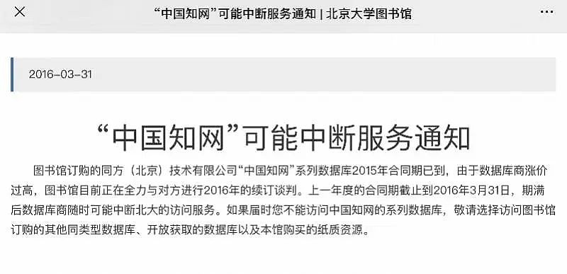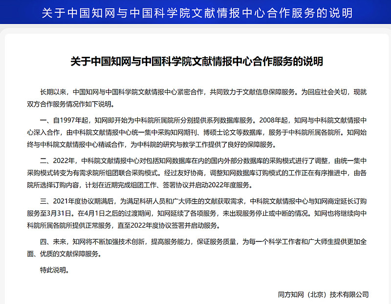 近期中国科学院文献情报中心称,从4月20日起停用CNKI数据库,该通告表示:“2021年,中科院集团CNKI数据库订购总费用达到千万级别,该数据库高昂的订购费用已成为中科院集团资源引进中的‘巨无霸’”。消息很快被媒体证实,被问及是否会恢复对知网的访问时,受访的负责人表示“至少今年没有这个计划”。