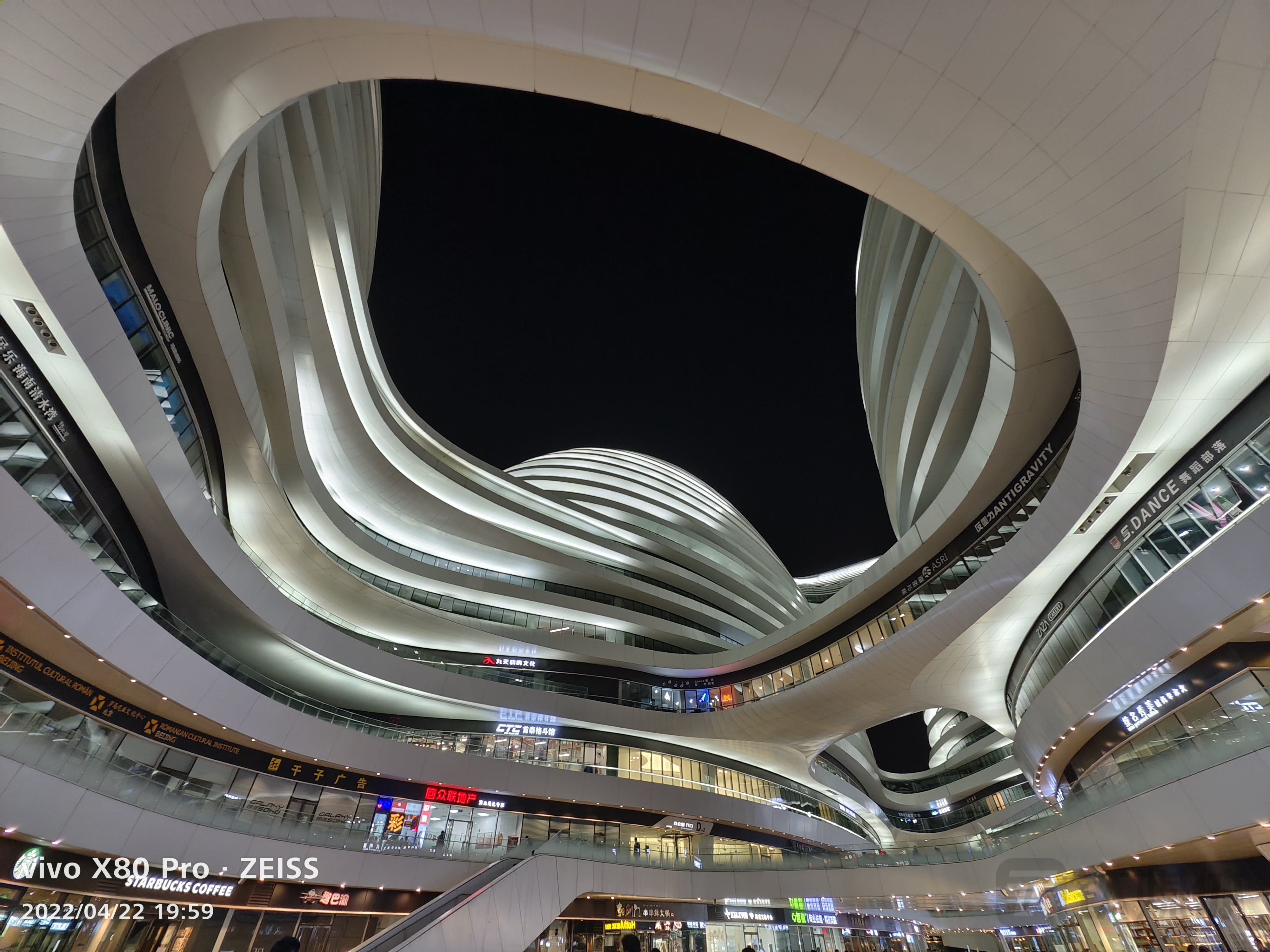 这张是采用了4800万像素的超广角镜头,变焦为0.6X下的拍摄效果。对于拍摄这种超广视角,建筑题材是再合适不过了。可以特别注意到天空和建筑的颜色,天空颜色就是完全的黑,不会发灰,而建筑物上的白色灯带也没有过曝,这就要得益于vivo的光学硬计算能力了。