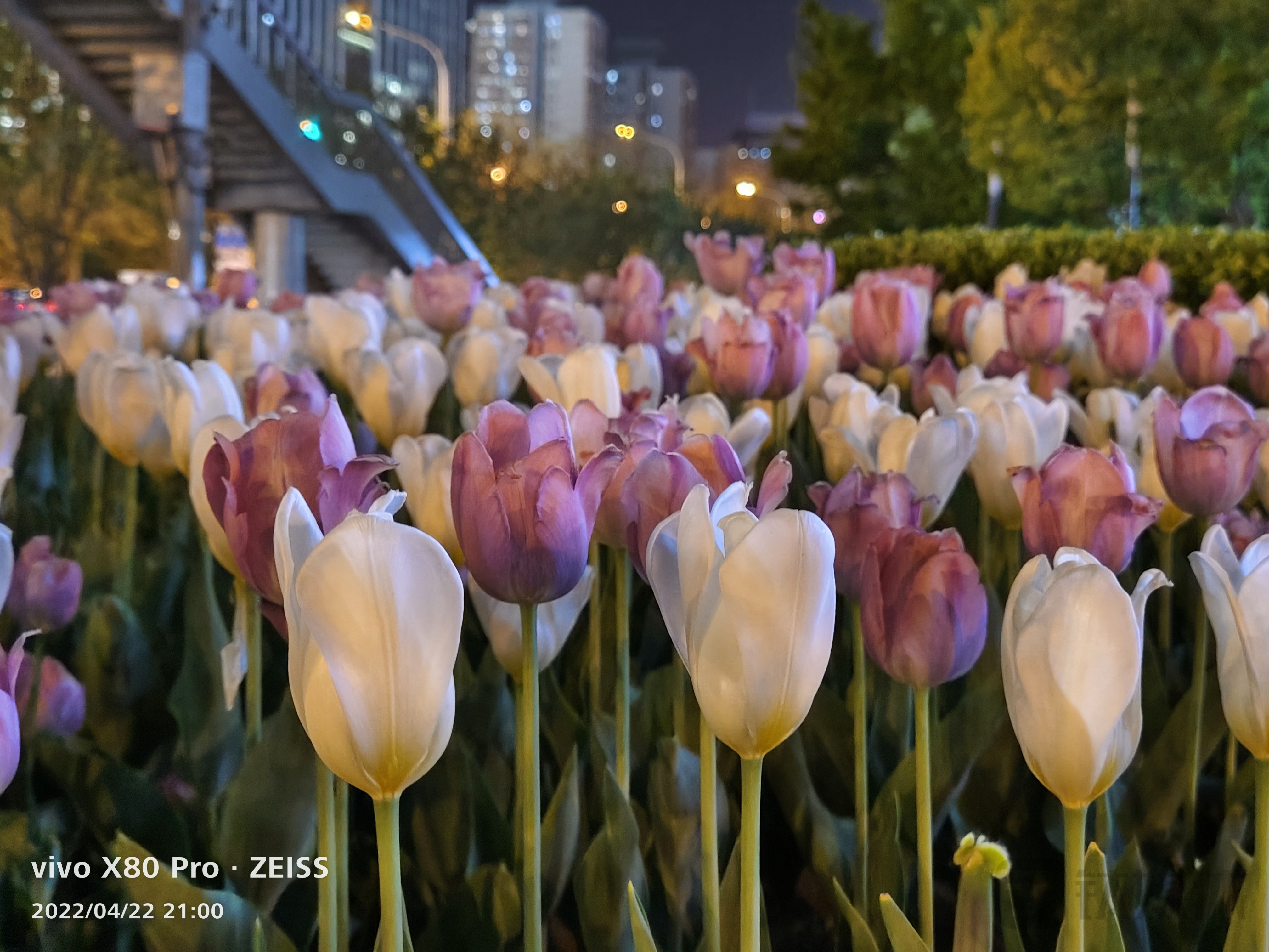这是晚上9点,在二环边上的银河SOHO,有一片郁金香,这个时间点实际上只有一些路灯光照条件。采用了vivo X80 Pro的5000万像素,1/1.3英寸超大底主摄,配备独家定制滤色片,获得更纯净画面,花瓣上基本上没有肉眼可见的噪点。