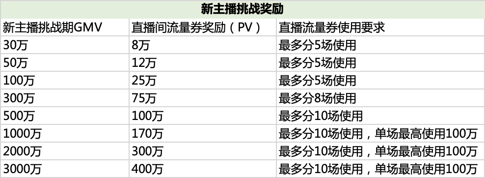 此外,淘宝直播对新咖的流量待遇则十分大度。冷启动阶段最高就会匹配到10万PV。一旦新主播发育成熟,进入主播挑战期,则会根据带货GMV表现给予更高配置的流量激励。“封顶400万!”