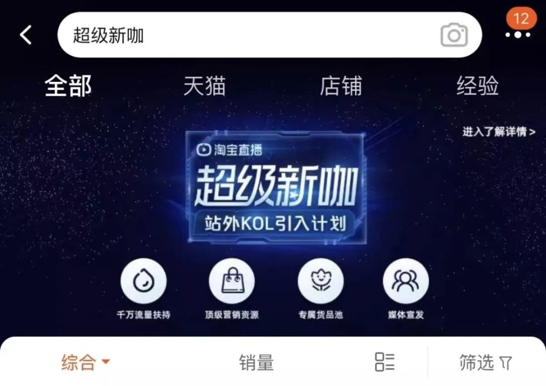 据悉,这场吸引站外KOL“招募令”并不低调,淘宝甚至开放了首页的搜索入口,为“超级新咖”的主播招募做了整个版面的宣传。