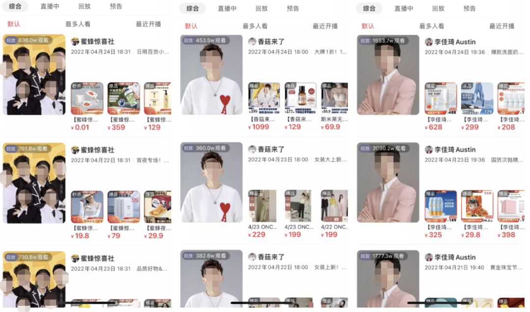 淘宝直播中蜂蜜惊喜社、香菇来了、李佳琦等直播间场观累计数据