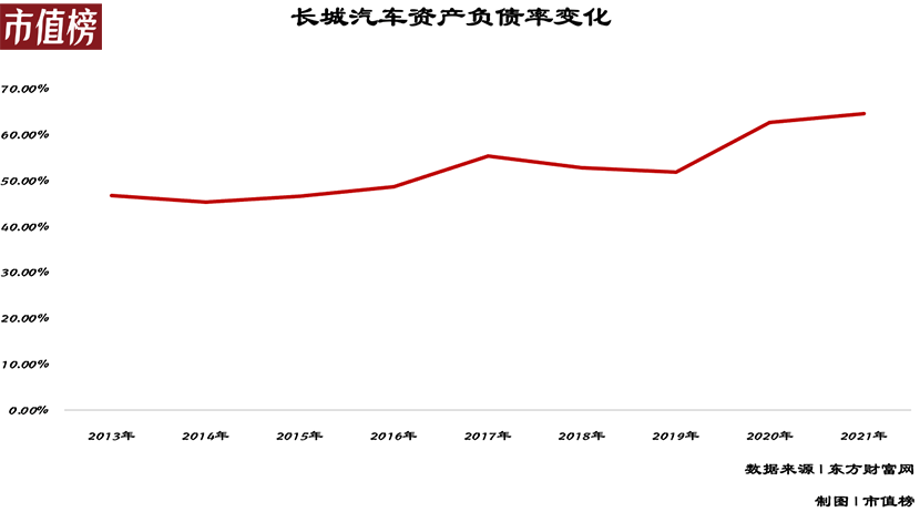 长城汽车的资产负债率在逐渐攀升,从2019年的51.9%到2021年的64.58%。