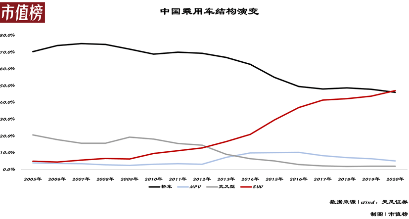第二个层面,2008年以后,中国汽车行业SUV市场快速扩容,长城成了最大的受益者,但也陷入路径依赖。