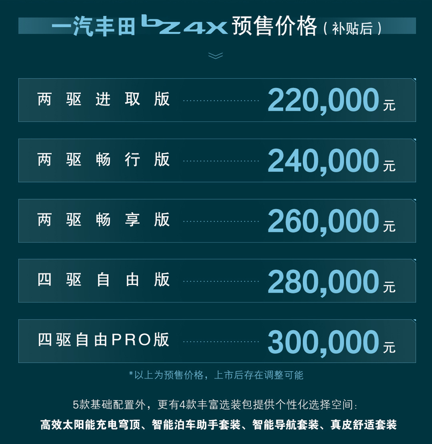 4月28日晚间,一汽丰田bZ4X正式开启预售,共计5款车型,预售区间为22-30万元。该车作为e-TNGA架构下首款纯电动车,自从去年上海车展亮相以来便受到广泛关注。对于一汽丰田来说,这款车型的推出也宣布其正式进军纯电动车市场。