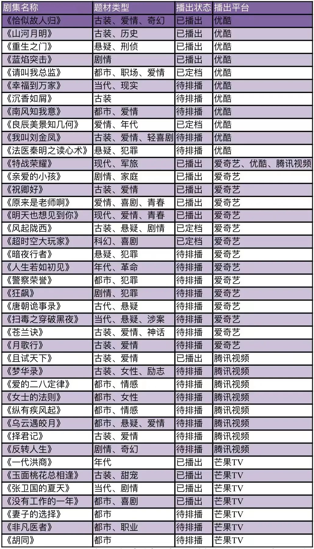整体来看,Q2剧集类型也非常多元。首先,在年代剧领域,各平台也有布局Q2芒果TV推出年代历史剧《一代洪商》,该剧讲述了20世纪民国至抗战时期,湘商艰难支撑国家半壁江山的家国故事,爱奇艺则有年代革命剧《人生若如初见》,优酷则拿出古装历史剧《山河月明》。其次,军旅题材重回观众视线,讲述“兵王成长之路”的《特战荣耀》军旅题材外,Q2有可能上线由张若昀、白鹿、王景春呈现平凡基层民警故事的《警察荣誉》。另外,女性题材有望在Q2上线的有腾讯的《女士的法则》和优酷的《她们的名字》;都市爱情剧的储备也很丰富,例如《爱的二八定律》《南风知我意》《请叫我总监》等。
