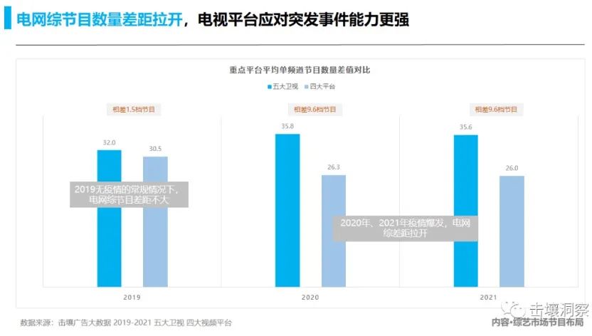湖南、浙江、江苏、东方、北京五大卫视较2019年疫情之前,开播的综艺数量有增无减,而网综则呈现出2019到2021年连年递减的现状。