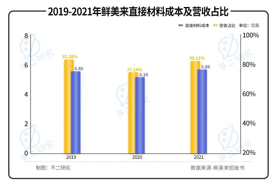 「不二研究」认为,由于鲜美来业务发展受制于上游,其毛利率很大程度上受到原材料采购费用的拖累。根据招股书,2019-2021年,鲜美来采购的直接材料分别为5.80亿元、5.10亿元、5.89亿元,在主营业务成本中的占比分别为81.20%、77.14%、80.11%。