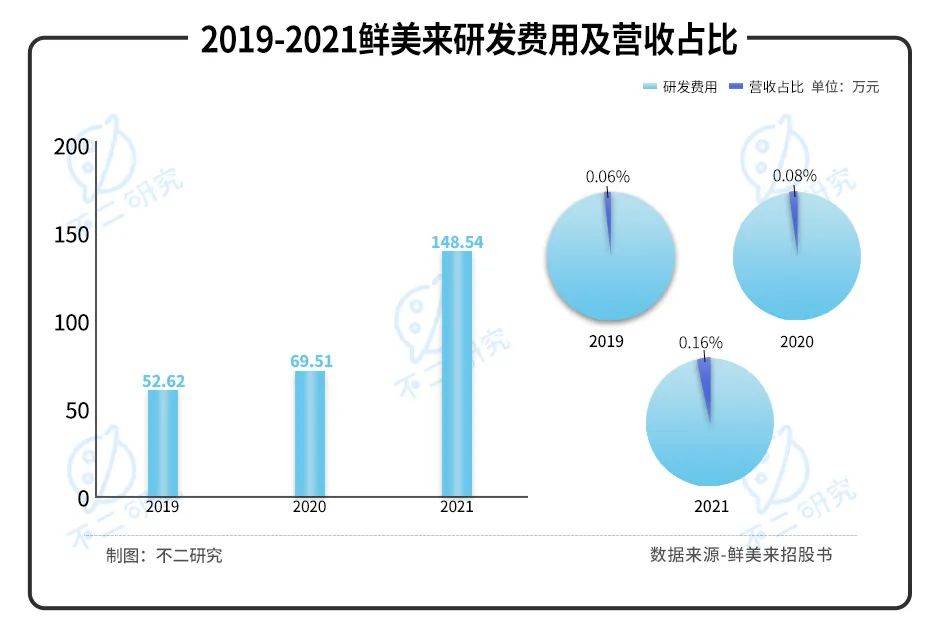 新品的开发势必要加强研发投入。根据招股书,2019-2021年,鲜美来的总研发支出只有270.67万元,占营业收入的比例分别为0.06%、0.08%和0.16%。
