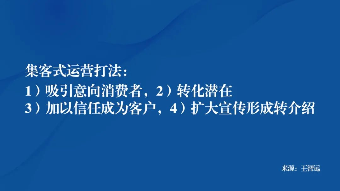 也就是:1)吸引意向消费者,2)转化潜在,3)加以信任成为客户,4)扩大宣传形成转介绍。