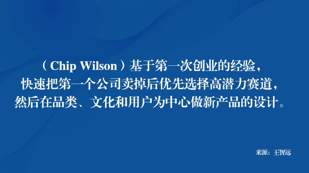 由此的快速回放可见,威尔逊(Chip Wilson)成功是基于第一次创业的经验,并有极具高视野的洞察,快速把第一个公司卖掉后再优先选择「高潜力」的细分赛道。