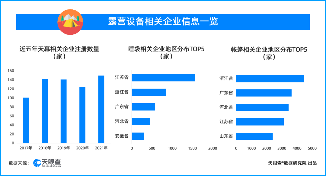 如果按照露营装备区分,目前中国拥有33000余家帐篷相关企业、1100余家天幕相关企业、5000余家睡袋相关企业、1200家折叠椅相关企业。