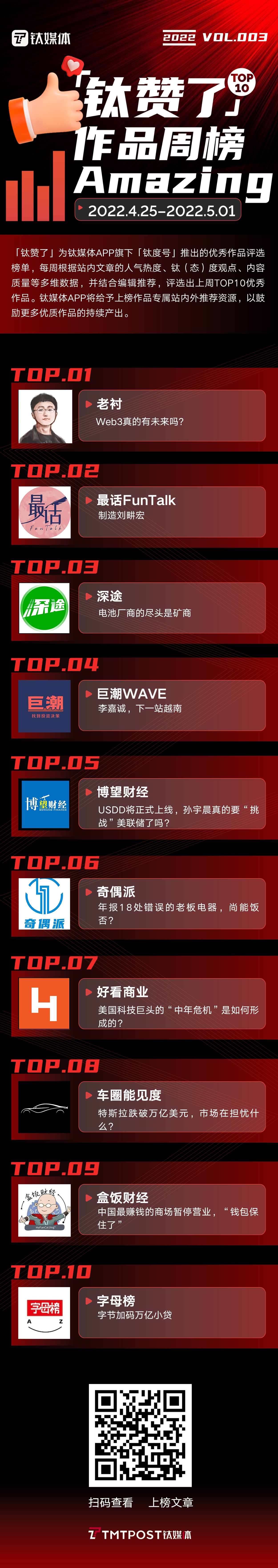 「钛赞了」为钛媒体APP旗下「钛度号」推出的优秀作品评选榜单,每周根据站内文章的人气热度、钛(态)度观点、内容质量等多维数据,并结合编辑推荐,评选出上周TOP10优秀作品。钛媒体APP将给予上榜作品专属站内外推荐资源,以鼓励更多优质作品的持续产出。