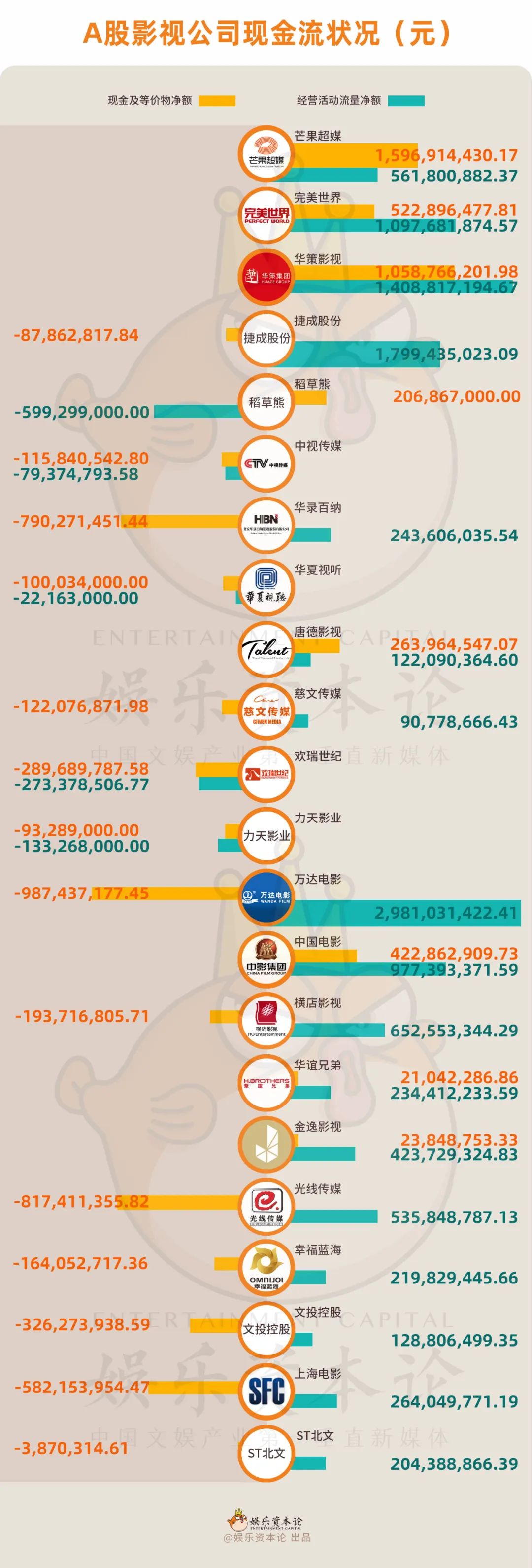 观察这些公司的现金流肖像,整体状况要好于上一年,共有19家公司经营活动流量净额为正,数量多于去年,还包括深陷泥淖的唐德、有巨额亏损的慈文以及ST北文,2020年经营活动流量净额为亏损状态的7家公司中也有6家扭亏。![]()