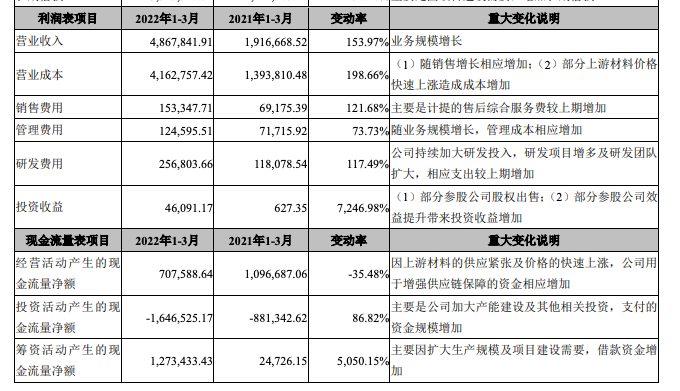 另据中国汽车工业协会数据显示,2022年一季度,新能源汽车产量为129.3万辆,销量为125.7万辆,都超过百万辆大关,同比增长为1.4倍,市场占有率达到19.3%。从这组数据上看,宁德时代的营收增速超过了新能源汽车产销增速,同样处于一个较快增长的水平。