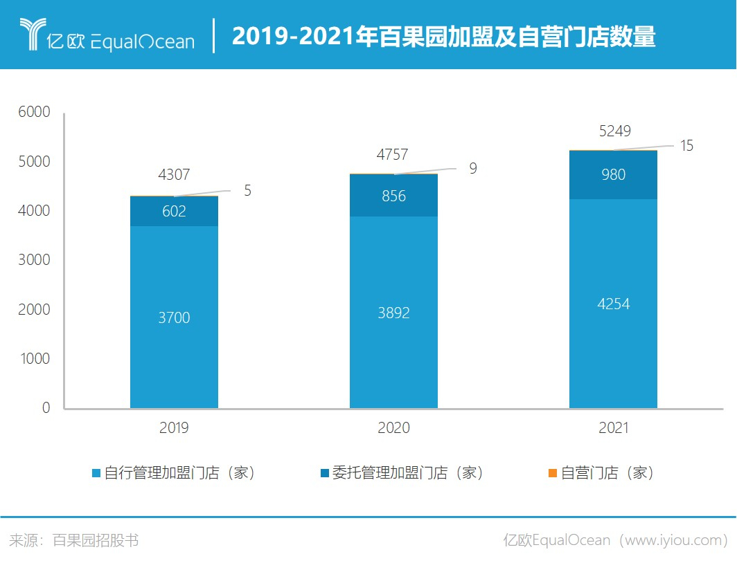 目前百果园的5351家门店中,有5336家为加盟门店,只有15家为自营门店。所有加盟門店中,4382家为自行管理,其余954家是委托区域代理管理。