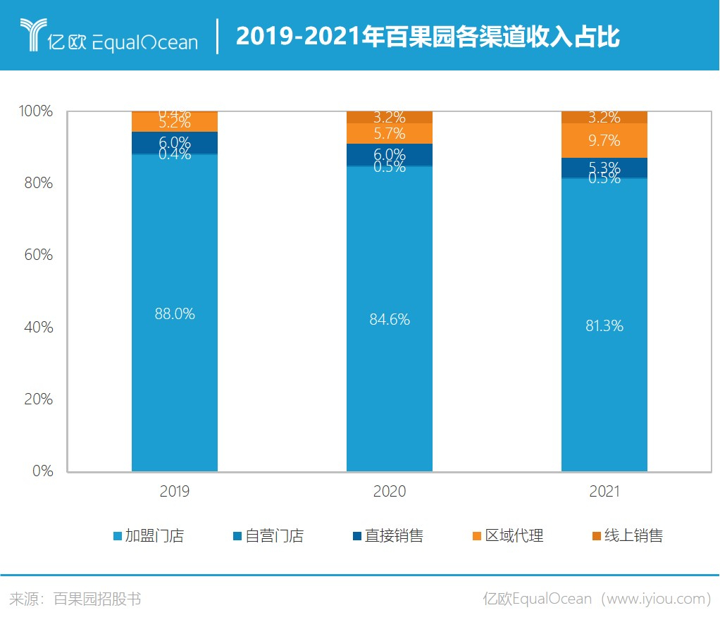 根据招股书,2019-2021年,百果园的营业收入分别为89.76亿元、88.54亿元、102.89亿元,其中大部分收入来源于加盟门店。尽管加盟门店的销售收入占比从2019年的88.0%下降到2021年的81.3%,但依然是公司最主要的营收支柱。