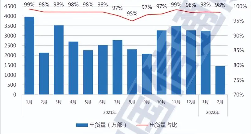 2022年第一季度的成绩可以说相当惨淡,手机出货量大幅度下滑,特别是国产手机下降的尤其明显。中国信息通信研究院近日发布的《国内手机市场运行分析报告》显示,2022年2月,国内市场手机出货量1486.4万部,同比下降31.7%;其中,国产品牌手机出货量1278.3万部,同比下降34.7%。