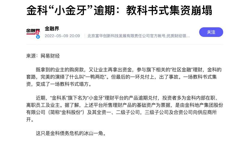 近日,据网易新闻报道,“金科系”旗下名为“小金牙”理财平台的产品逾期兑付,投资者多为金科内部在职、离职员工及业主,投资产品的底层资产是金科的相关票据。