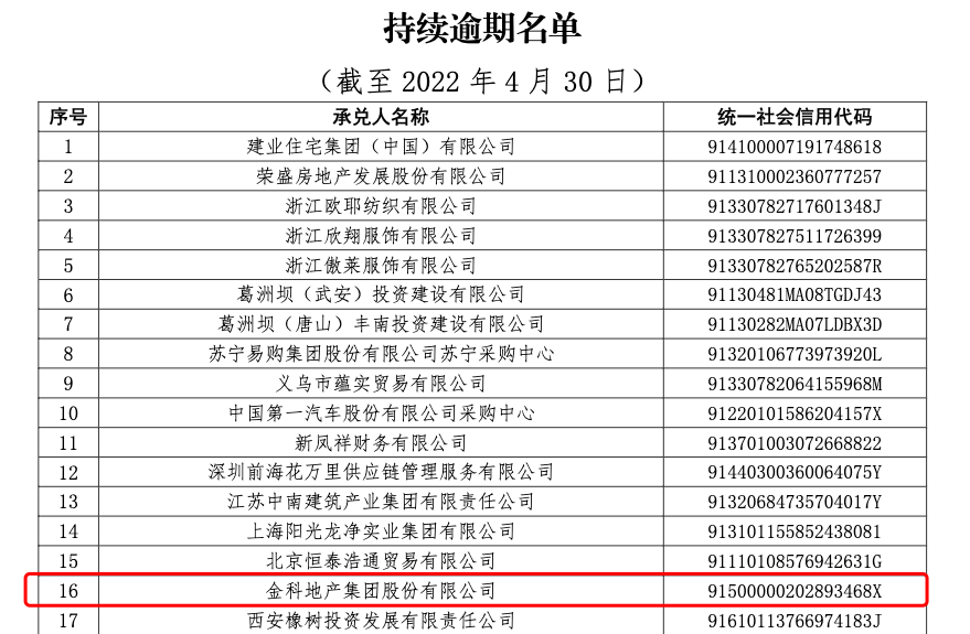2022年2月,金科股份披露的数据显示,2021年12月末,公司商票余额为86.36亿。根据上海票据交易所披露的商票持续逾期名单,金科地产集团股份有限公司连续出现在名单当中。截至2022年4月30日,金科地产商票累计逾期金额达2.17亿,月末逾期余额1.62亿,较3月末显著上升。