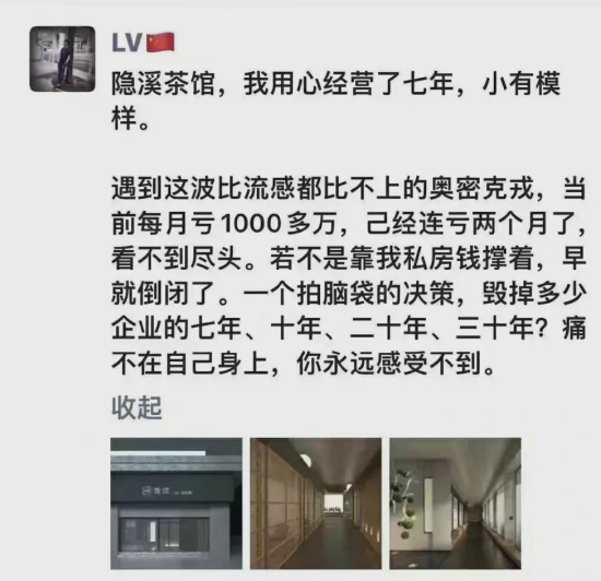 5月4日,一张网传截图显示,隐溪茶馆老板吕义雄在朋友圈发文,称这波疫情影响下,隐溪已经连续两个月月亏1000多万元,且目前“看不到尽头,若不是靠我私房钱撑着,早就倒闭了”。