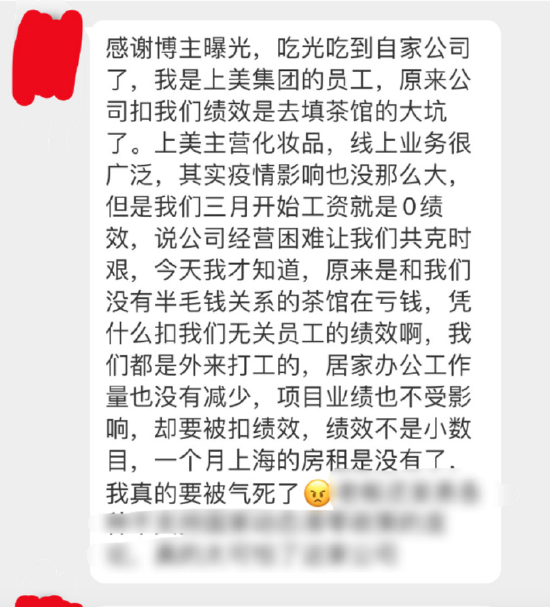 5月5日,多名上美集团旗下的化妆品品牌韩束内部员工相继爆料,自3月起工资就是0绩效,且“扣绩效不给说明和书面通知,只是口头通知一下就全部扣除”“来填茶馆的坑”。