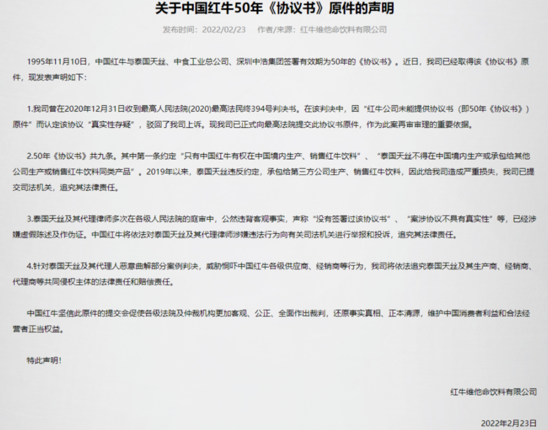 中国红牛多次发布声明称,中国红牛在创立之前与泰国天丝、中国食品工业总公司、深圳中浩集团等签署期限为50年的《协议书》是其宪章性文件,中国红牛认为,该协议是中国红牛中泰企业开启合作的前提和关键性法律文件,也为“红牛”品牌在中国市场创建和发展奠定了坚实的基础。因为生产许可和商标注册都是中方企业解决的。
