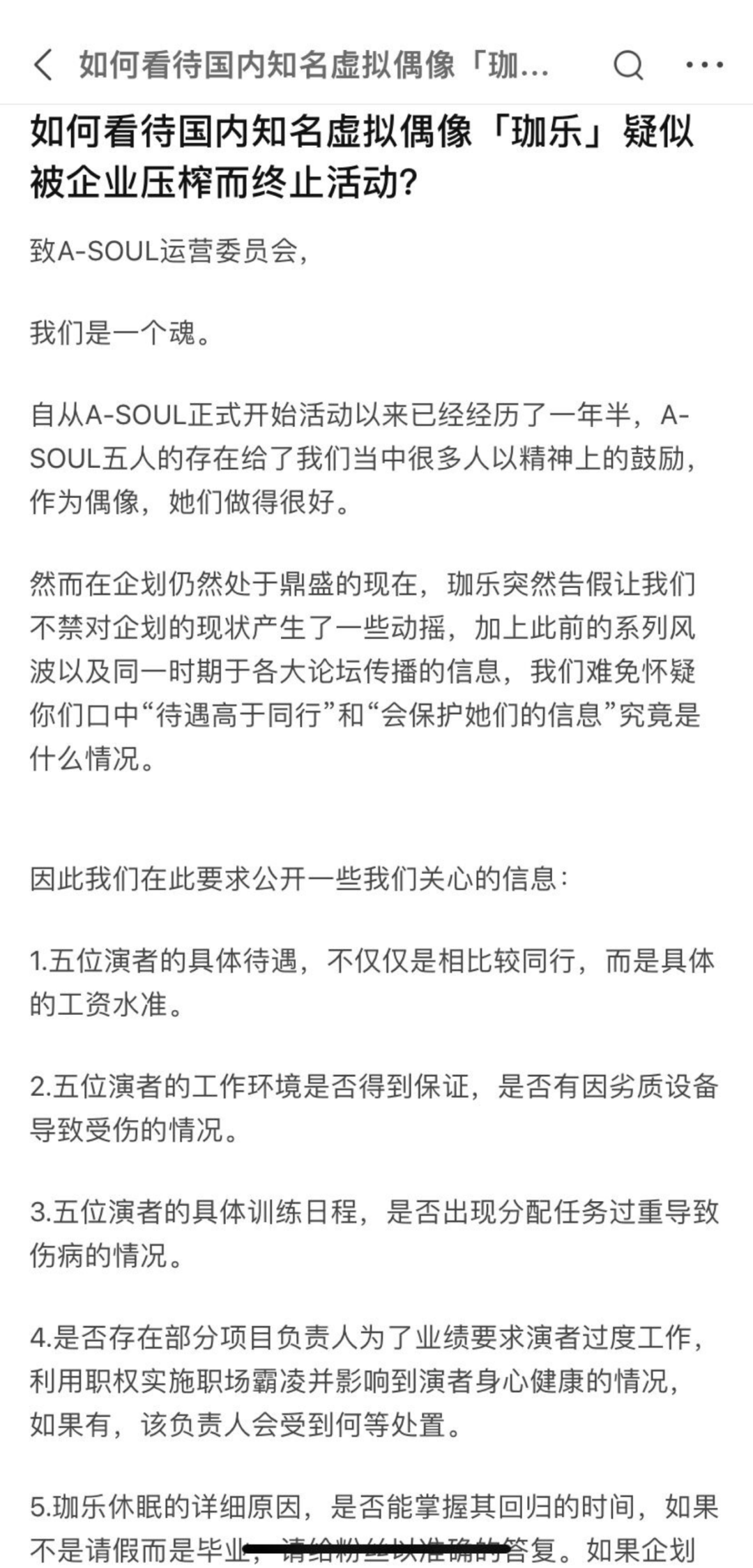 知乎上的A-SOUL粉丝们就是一个典型案例。“如何看待国内知名虚拟偶像‘珈乐’疑似被企业压榨而终止活动”的问题中,提问的知乎网友甚至在问题描述部分直接放上了一封致A-SOUL制作委员会的公开信,信中明确希望官方能够公开六点信息,打消粉丝们的怀疑,包括了五位中之人的具体待遇、工作环境、训练日程、是否存在职场霸凌以及珈乐中之人休眠的真正原因。