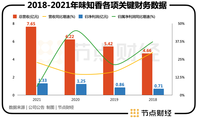 本次财报所展现的营收、净利双增背后,实际上,味知香更值得关注的是首次出现了净利润年度“个位数增速”。要知道,2020年味知香净利润增速达45%,也是近年来最高值。2021年财报里对净利润下降的解释是:“受新冠疫情零星散发、上游原材料上涨、部分期间费用增长等因素,公司净利润受到一定影响”。