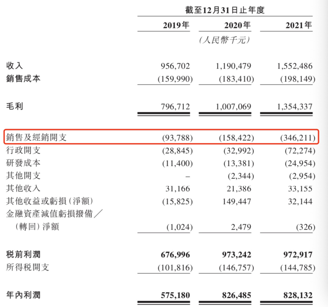 具体而言,以平台营销费、平台服务费和KOL合作费为主的线上营销开支占比在逐年提升,从2019年的68.7%增至2021年的88.5%。线下营销和雇员薪酬的开支,各占销售及经销总开支6.7%、3.6%。
