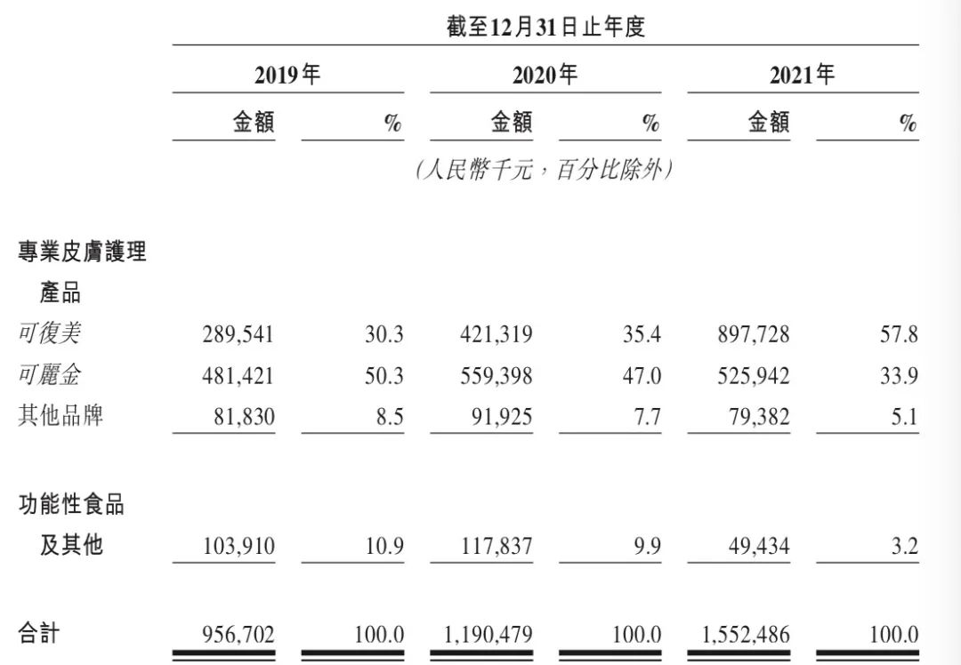 此番成绩,主要来自巨子生物的两大王牌产品:可丽金与可复美。这两个品牌分别是2021年中国专业皮肤护理产品行业第三和第四畅销品牌,为巨子生物贡献了90%的收入。