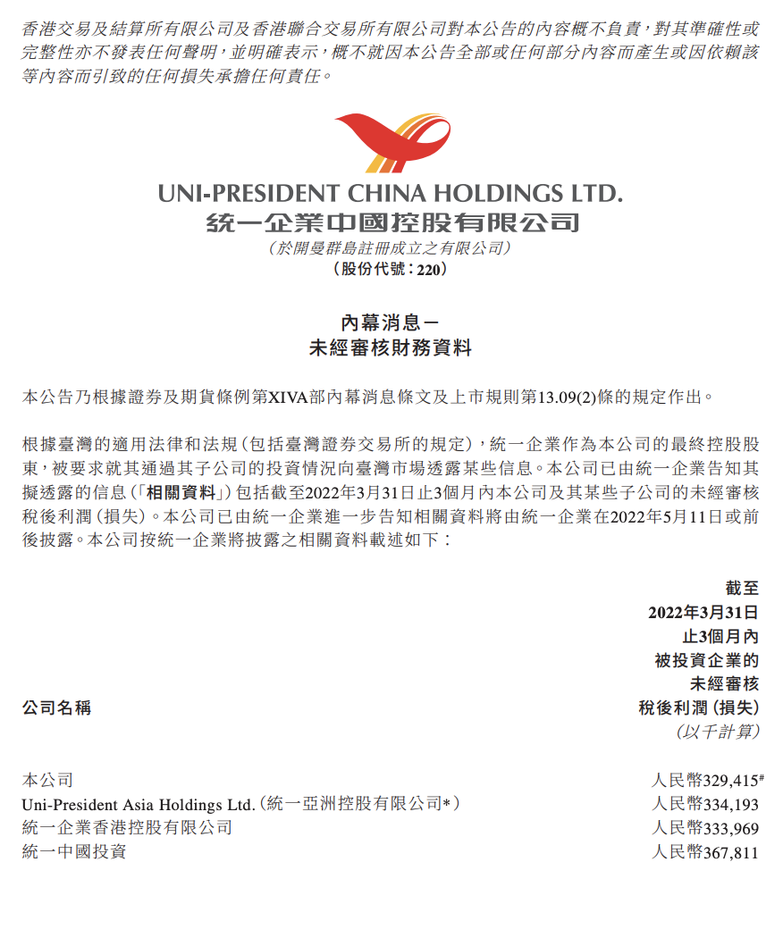 5月11日,统一企业中国控股有限公司披露了2022年第一季度未经审核的财务资料。截至2022年3月31日止3个月,统一企业税后利润3.29亿元,较2021年同期下降约12.8%。