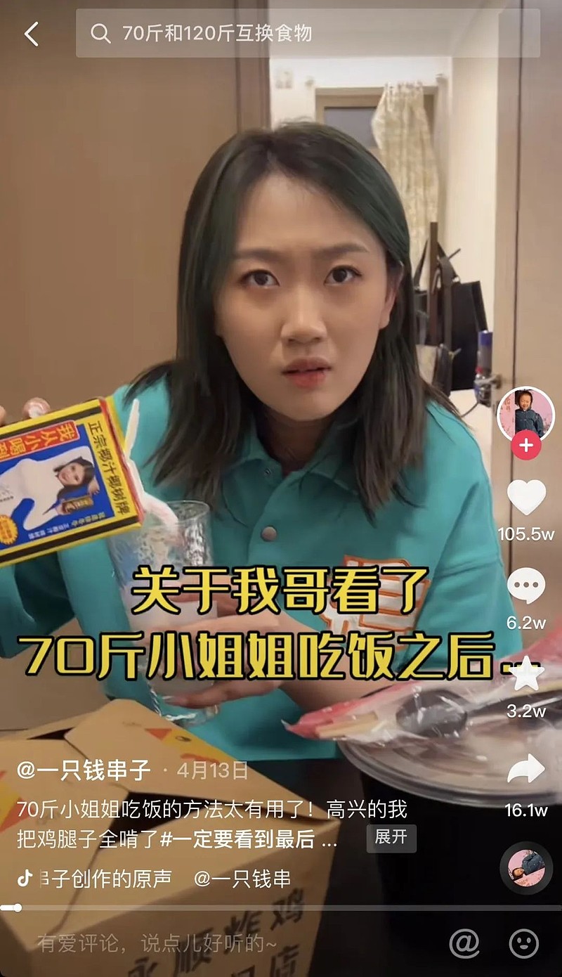 在小红书一炮而红后,就你吃不饱于3月中旬入驻抖音,目前共发布33期视频,粉丝数已达到170万。账号的出镜人70斤女孩“头子”的“厌食式”吃饭方式,也被诸多博主模仿,一度成为潮流。