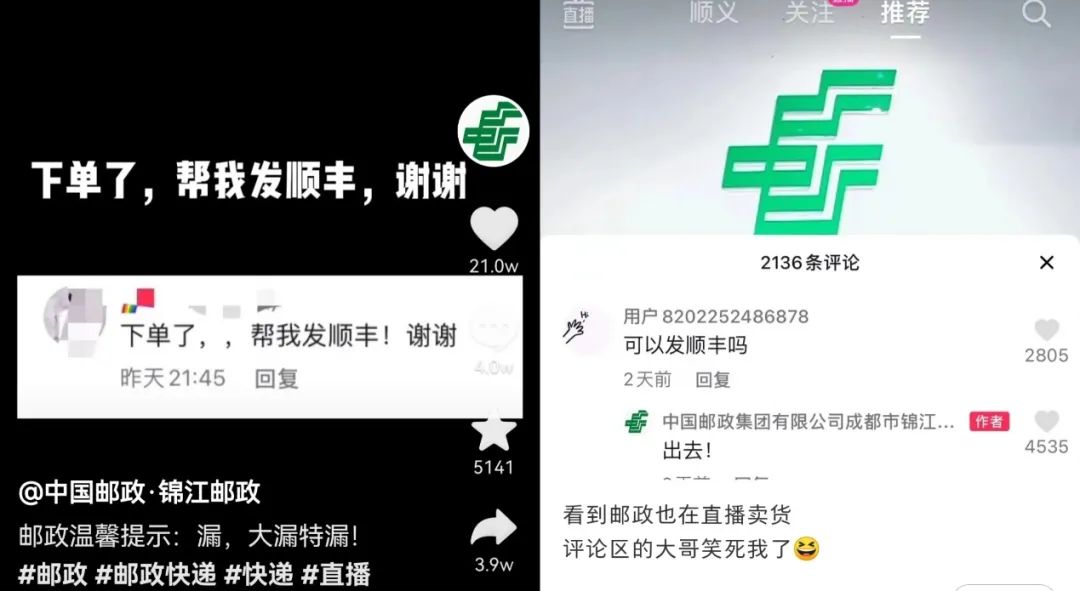 品牌出圈,伴随着各种偶然性,邮政直播突然在小红书、抖音等社交平台火起来,还是因为“顺丰梗”——在锦江邮政的抖音直播间中,有网友询问:“下单了,能不能发顺丰?”锦江邮政用调侃的语气怼了回去:“出去出去!”