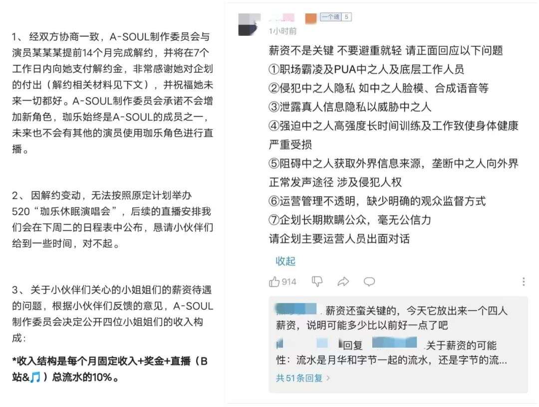 5月14日,A-SOUL官方终于就近期争议发布说明,对外公布了中之人的薪资构成,表示与成员珈乐的幕后扮演者解约,无法按照原定计划举办520“珈乐休眠演唱会”,并否认存在“霸凌、压榨”情况。同时,还附上了一页解约合同文件。