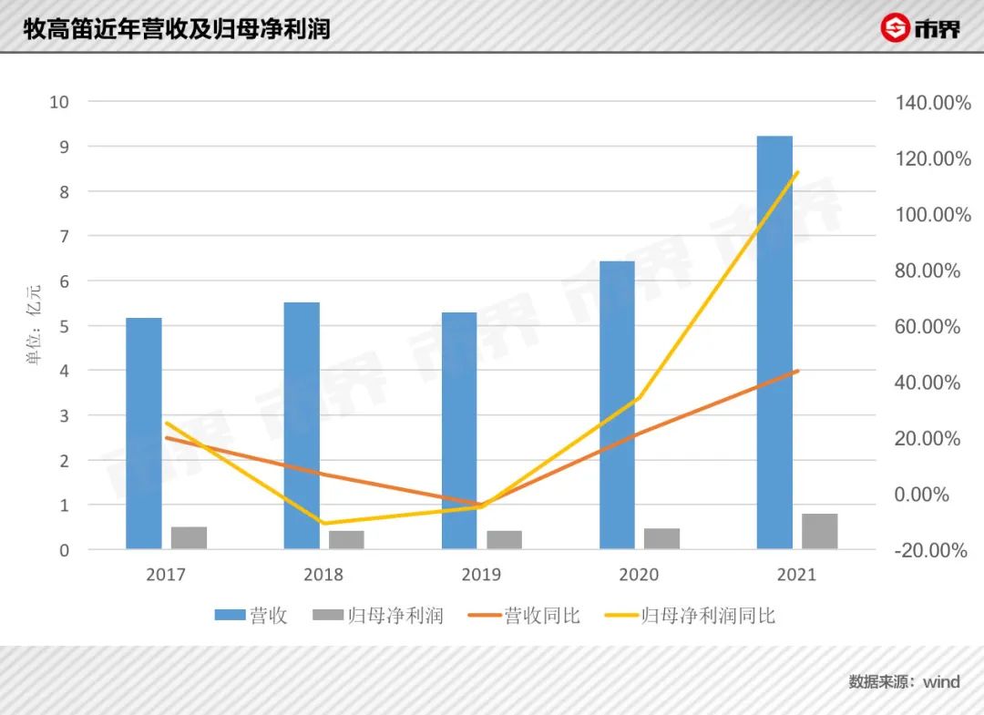 自上市以来,到疫情之前的2019年,牧高笛的业绩不温不火,甚至还出现了负增长。不过,近两年增长很快,尤其是2021年,实现营业收入9.23亿元,同比大增44%;归属母净利润7900万,同比增长了71%。