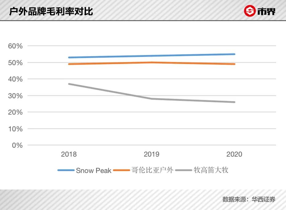 Snow Peak成立于1958年,2014年上市。据华西证券报告,2018-2020 年,Snow Peak毛利率持续高于哥伦比亚户外以及牧高笛旗下大牧品牌。
