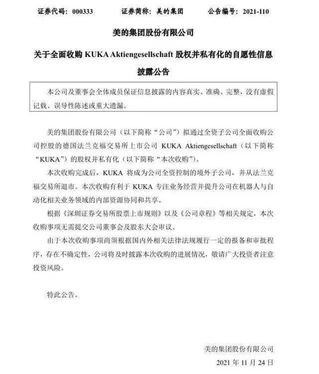 2021年11月24日,美的集团公告称拟通过全资子公司全面收购库卡股权并私有化,但考虑到目前美的自身在机器人领域积淀依然比较浅薄,此次私有化,能否实质性地推动家电制造巨头与工业机器人巨头强强联合,仍是一个谜题。
