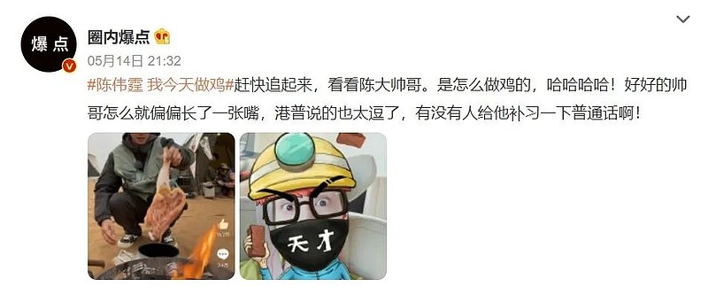 陈伟霆自2014《古剑奇谭》走红至今,已在内地演大制作剧男主7年,但本人说话仍是一口浓重的港普。综艺也乐于用他的港普做话题,他近期录制的综艺《一起露营吧》就诞生了“陈伟霆锡湿不分”“陈伟霆我今天做鸡”等与其口音相关的热搜。