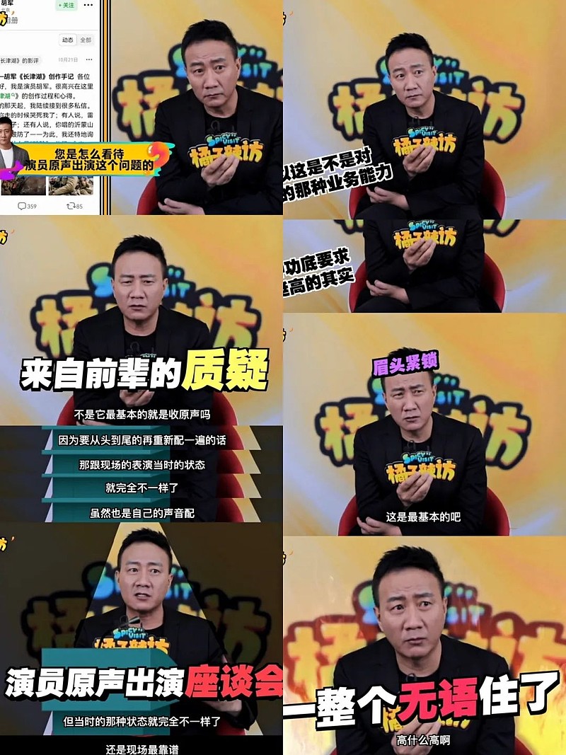 一些“演员的本分”逐渐被遗忘。橘子娱乐在专访胡军时曾问他如何看待演员原声出演,他有些疑惑地回答:“它最基本的不就是收原声吗?从头到尾再配一遍的话,跟现场的表演当时的状态就不一样了。”记者再追问这是否对演员功底有要求,胡军眉头紧锁:“这是最基本的吧?高什么高啊?”