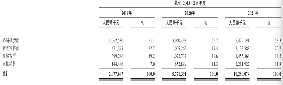 更值得注意的是,2021年,洪九果品营收的53.3%来自终端批发商,20.7%来自生鲜电商、社区团购等新兴零售商,商超客户占比14.2%,直销占比11.8%。其中商超客户明显减少,而新兴零售商的收入和占比都有一定的提升。而新零售模式,或许是洪九果品创造新机遇的渠道。