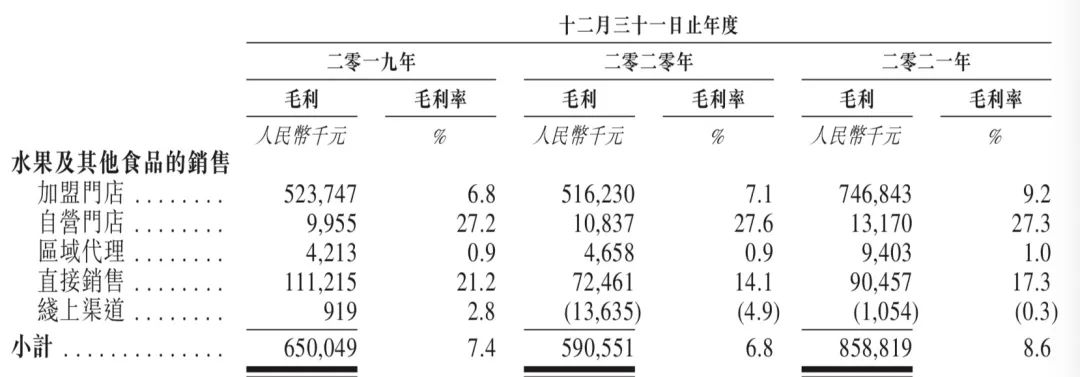 百果园的毛利率为9.8%、9.1%和11.2%,这些数值为综合毛利率。在2021年,百果园加盟门店端毛利率约为9.2%,自营门店则是27.3%。然而,9.2%都是百果园销售给加盟门店商品的毛利率,而不是加盟门店的,百果园从加盟门店获取的收入,相当于加盟门店的成本。