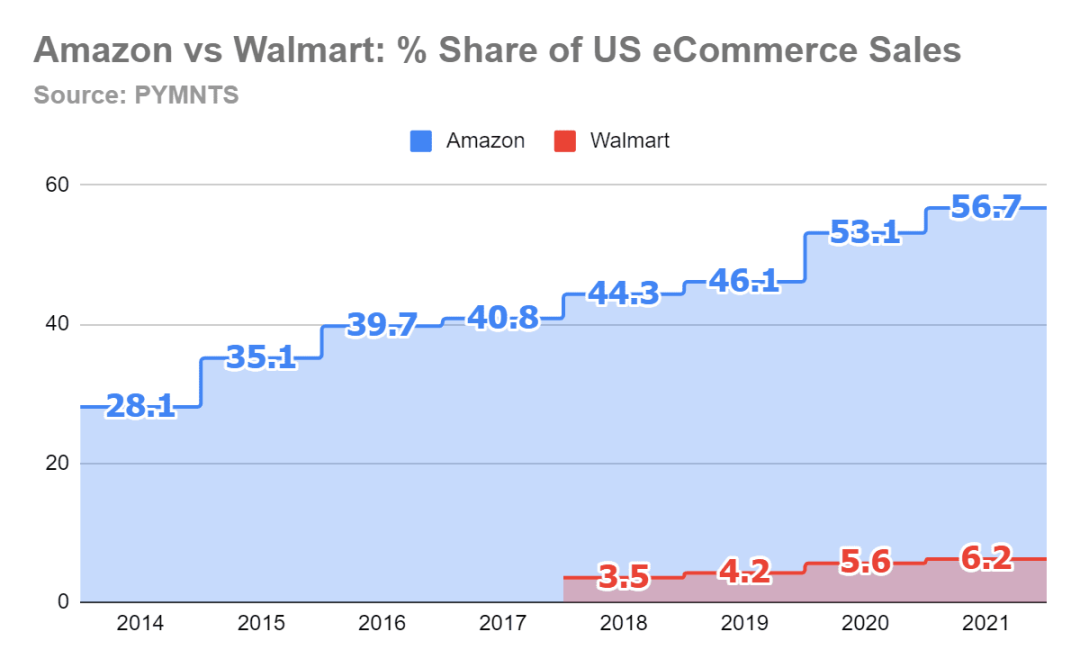 另据PYMNTS的数据,在2021年,美国近60%的线上零售购买在亚马逊上完成,其在美国零售市场达到了56.7%。而沃尔玛的电商,到2021年,市场占有率也仅达到了6.2%。