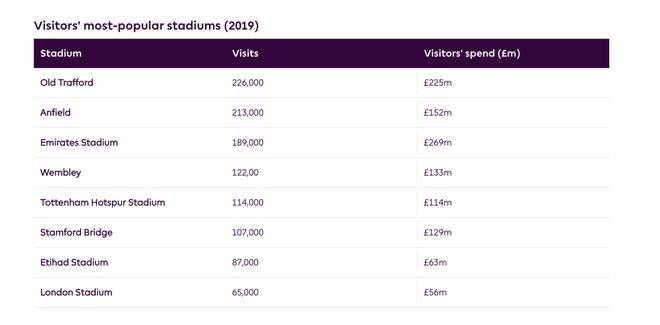 老特拉福德、安菲尔德等著名球场,已经成为了球队的重要收入来源。数据来源:英国国家旅游局「英国足球旅游」报告