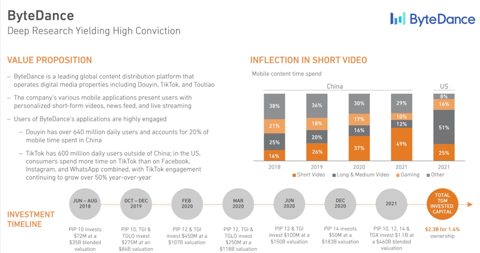而据接近字节跳动人士透露给《中国企业家》的一张字节跳动PPT显示,老虎环球基金在2021年曾以4600亿美元的估值投资字节跳动11亿美元。相比去年4600亿美元的高点,字节跳动目前的估值大幅下降,缩水近一倍。