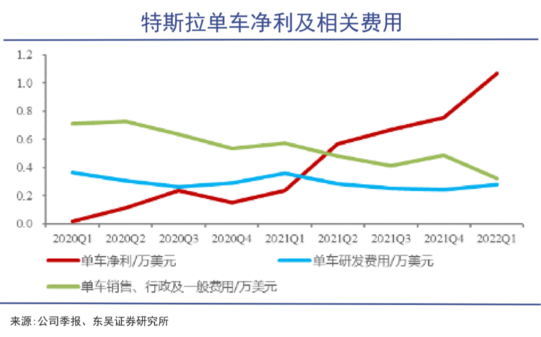 观察这两年特斯拉的汽车业务,其单车盈利创出新高,随着规模提升,边际成本逐渐递减,相关费用在不断下降。扭亏后,特斯拉已经进入“生产-销售-盈利-再投资”的良性循环。