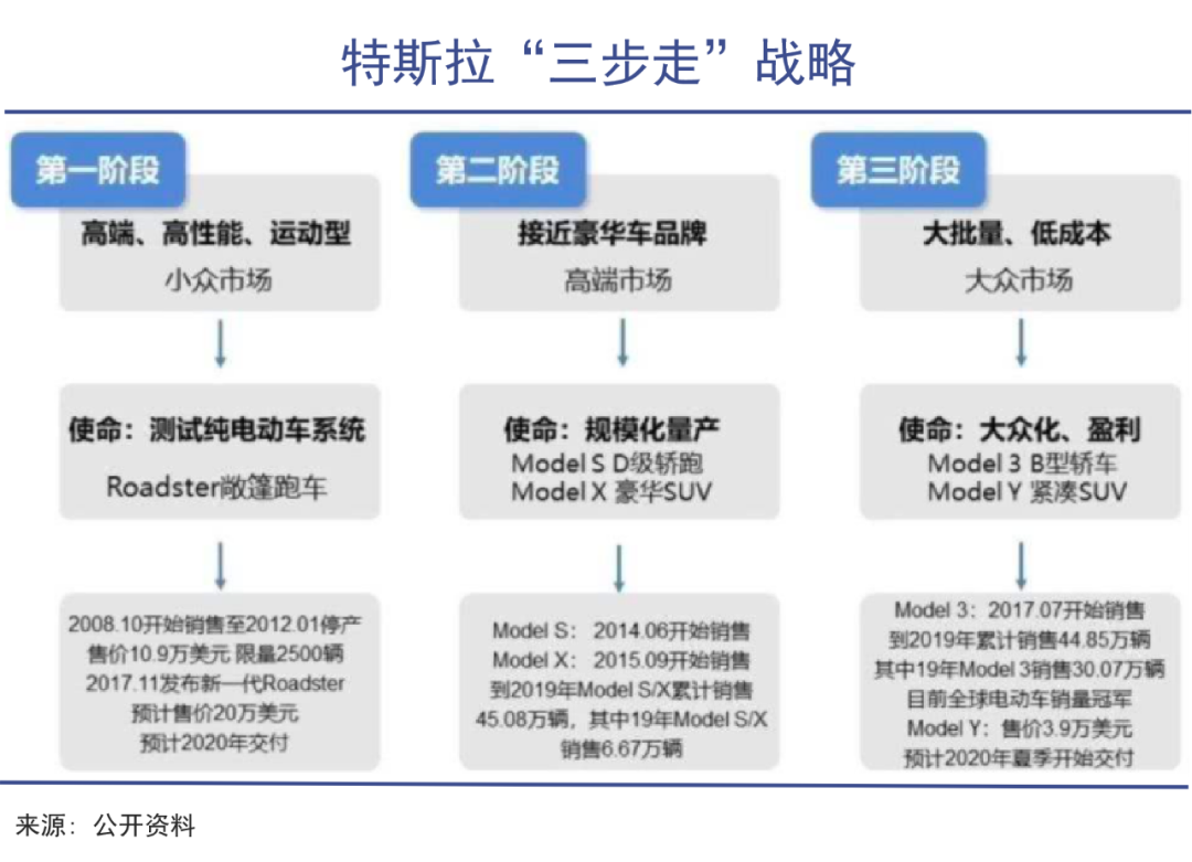 2006年,马斯克为特斯拉提出“Master Plan”的“三步走”战略:第一步,打造一台昂贵、小众的跑车(Roadster),切入高端市场得以立足;第二步,打造更便宜、销量中等的车(Model S、Model X);第三步,打造更加经济的畅销车型(Model 3、Model Y)。