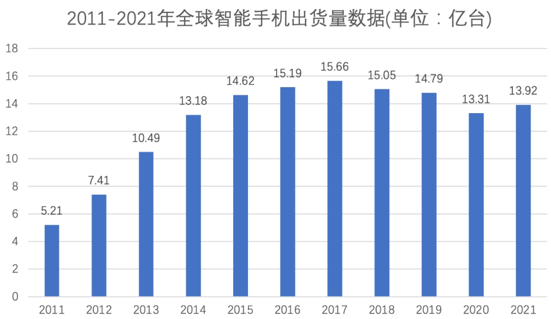 2011-2021智能手机全球出货量 制图:国际电子商情 数据来源:Counterpoint