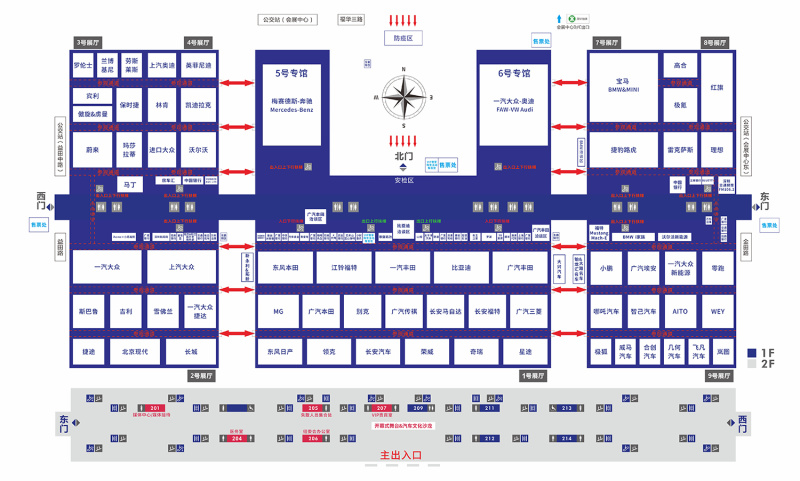 从官方公布信息来看,本次2022粤港澳大湾区车展启用深圳会展中心1-9号全部展馆,规模13万平米,吸引了100多个汽车品牌,具体展馆分布信息见下图: